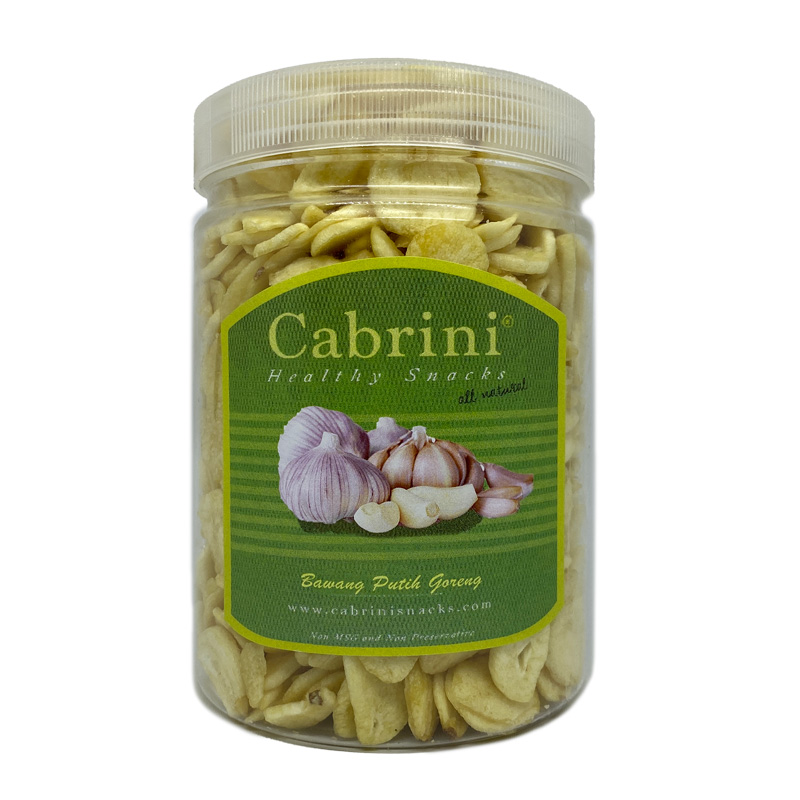 Bawang goreng ala Cabrini Healthy Snacks merupakan irisan bawang putih yang digoreng dengan vacuum fryer sehingga menghasilkan bawang goreng yang renyah, wangi yang sedap, gurih alami dan mengandung minyak sangat minimal. Sangat cocok untuk di taburkan di masakan anda tanpa memberikan rasa minyak berlebih. Cabrini Healthy Snacks adalah cemilan sehat yang diproduksi menggunakan bahan-bahan dari produsen lokal dan diolah dengan vacuum frying yaitu proses penggorengan dengan suhu rendah sehingga menghasilkan produk yang renyah tanpa mengurangi nutrisi yang terkandung serta tanpa menggunakan zat pewarna, pengawet maupun MSG. Semua produk Cabrini Healthy Snacks adalah produksi baru dengan tanggal kadaluarsa terhitung 3 bulan pasca-produksi.