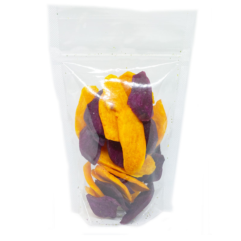 Cemilan sehat berserat tinggi berisikan campuran irisan lembar ubi ungu dan ubi kuning.