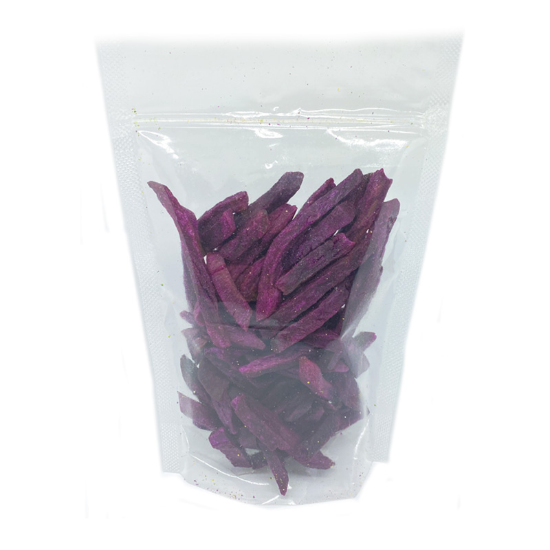 Cemilan sehat berserat tinggi berisikan campuran irisan jari ubi ungu.