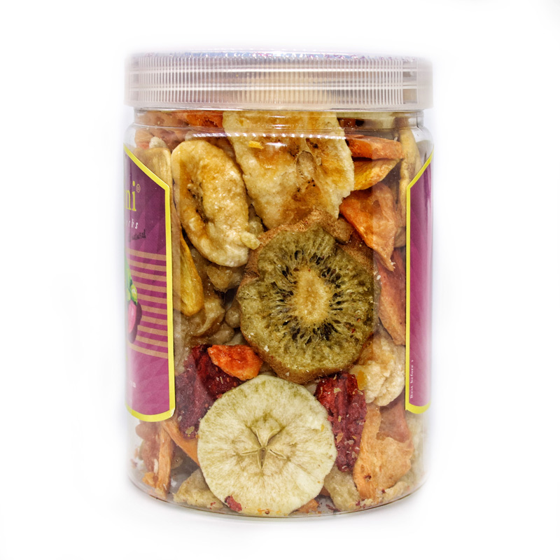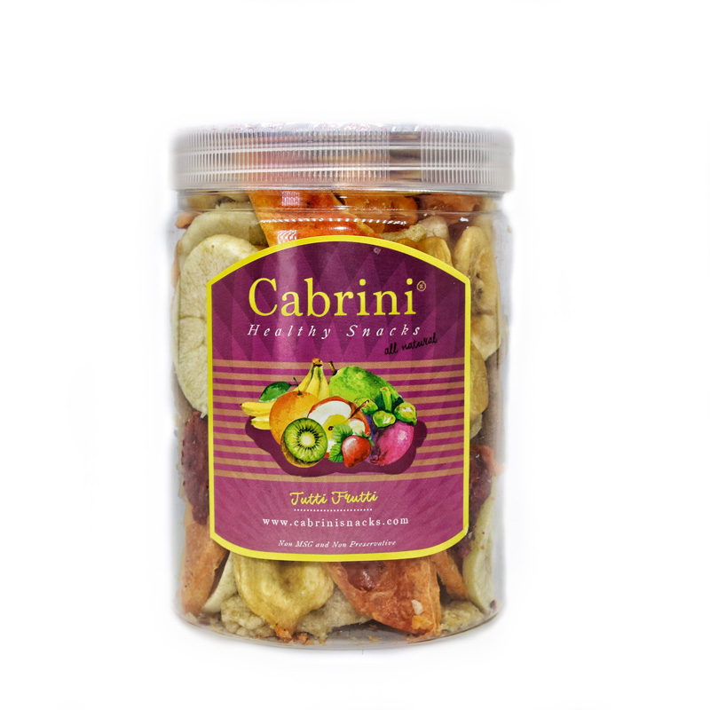 Tutti Frutti atau Keripik Buah Mix berisikan apel, pisang, pepaya, belimbing, kiwi, strawberry, nangka (musiman), salak(musiman), melon (musiman), mangga (musiman).